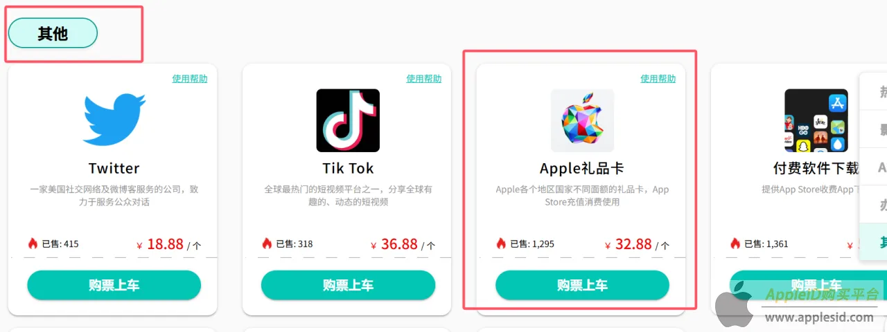 3、返回主页,往下拉,找到“其他”板块,大家就可以看到“Apple礼品卡”,点击“购票上车”。