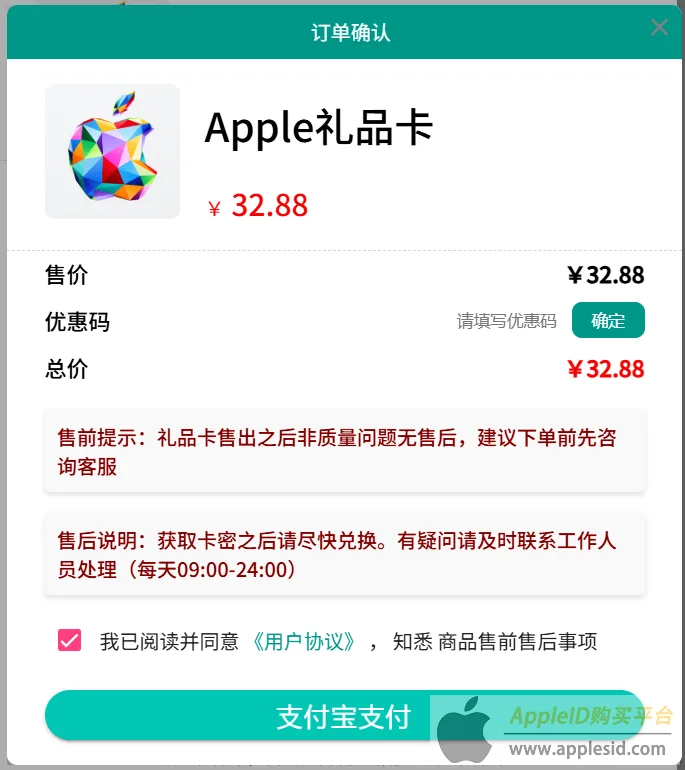 5、确认订单,没问题勾选同意条款,点击“支付宝支付”。跳转至支付宝收款码界面,我们扫码支付即可完成购买,页面将自动跳转到你购买的礼品卡界面。