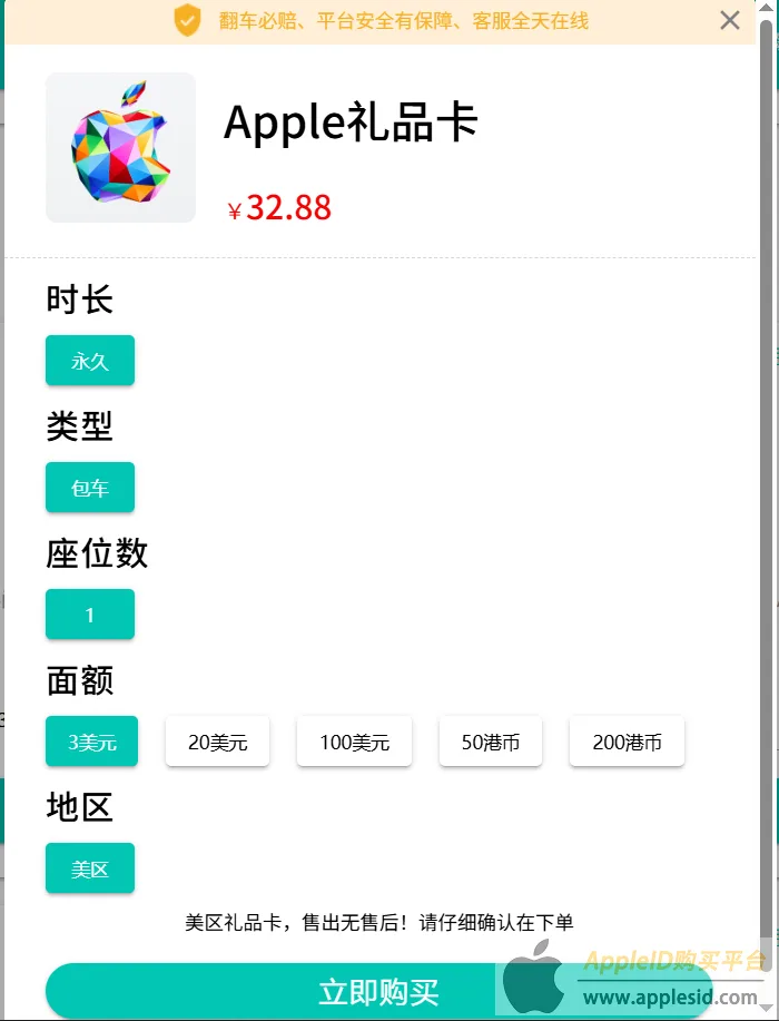 4、进入礼品卡购买页面,大家可以看到,这里出售的就是美区苹果礼品卡。选择购买面值,点击“立即购买”。
