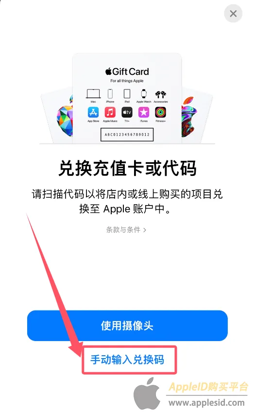 4、这里,就来到了礼品卡兑换界面,点击“手动输入兑换码”。