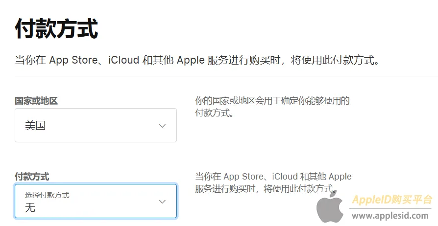 6、跳转到付款方式界面,这里就有国家或地区,我们选择自己需要的国家,比如说美国,付款方式一定要选无。