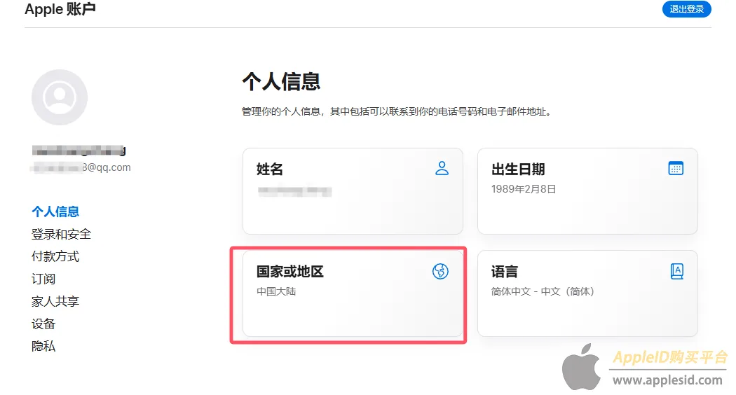 4、成功登录Apple账户,在“个人信息”里面,找到“国家或地区”,点击进入。