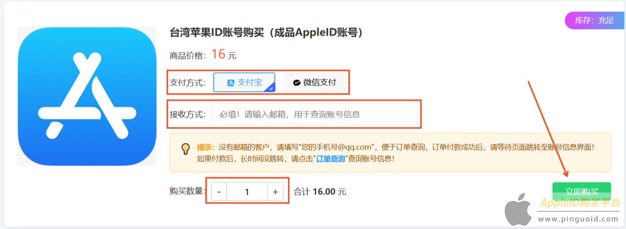 2、在购买页面选择支付方式(微信支付宝),填写邮箱,选择数量,点击“立即购买”。