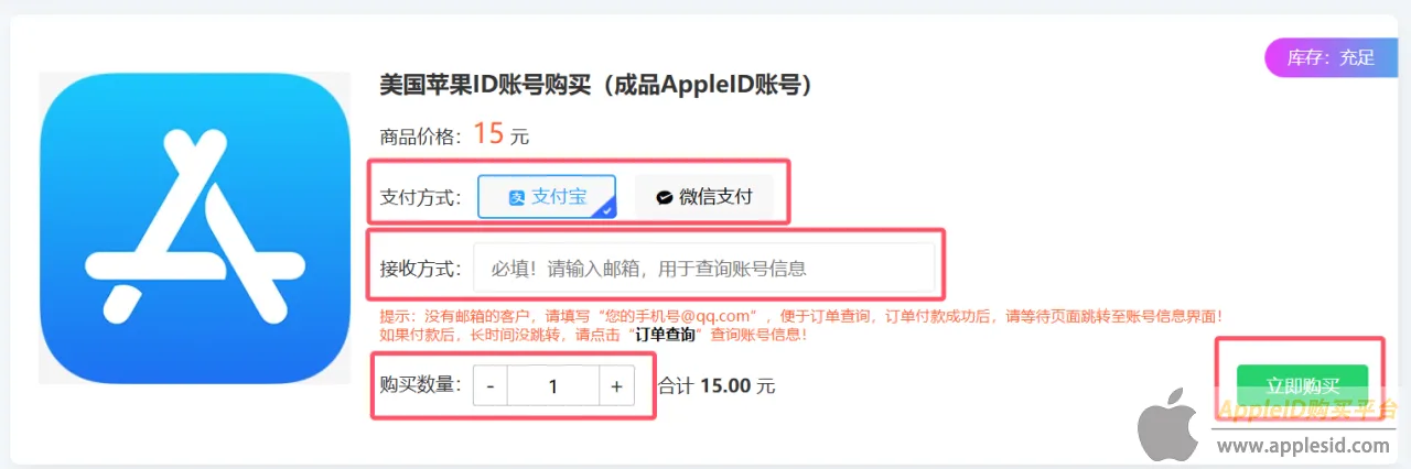 2、在购买页面,选择支付方式,填写邮箱,选择购买数量,点击“立即购买”。