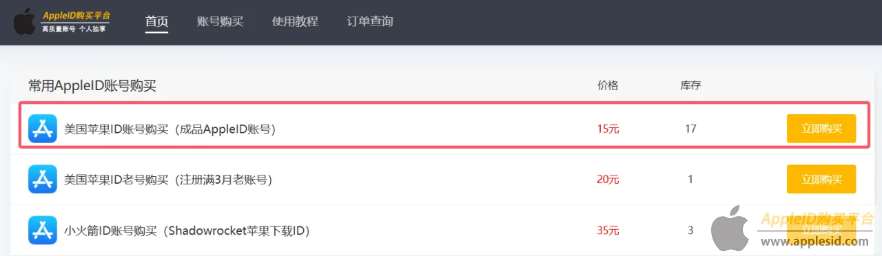 1、首先,进入上面购买平台网址,选择美国苹果ID账号,点击“立即购买”。
