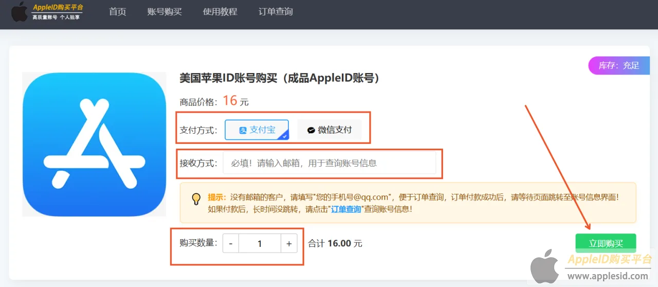 2、在购买页面选择支付方式,填写接收邮箱,选择购买数量,点击“立即购买”。