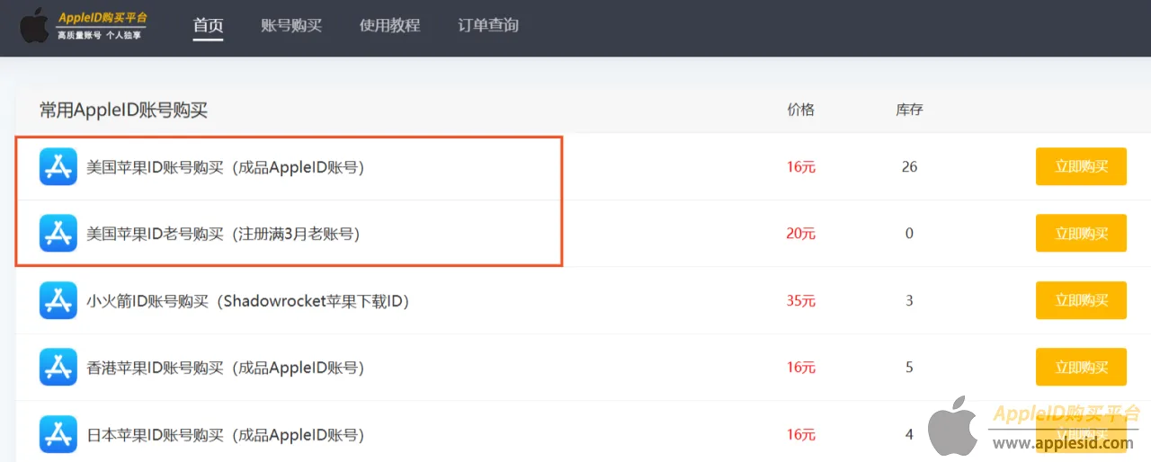 1、进入上面购买网站,选择自己需要的美国ID账号(新号或者老号),点击“立即购买”。
